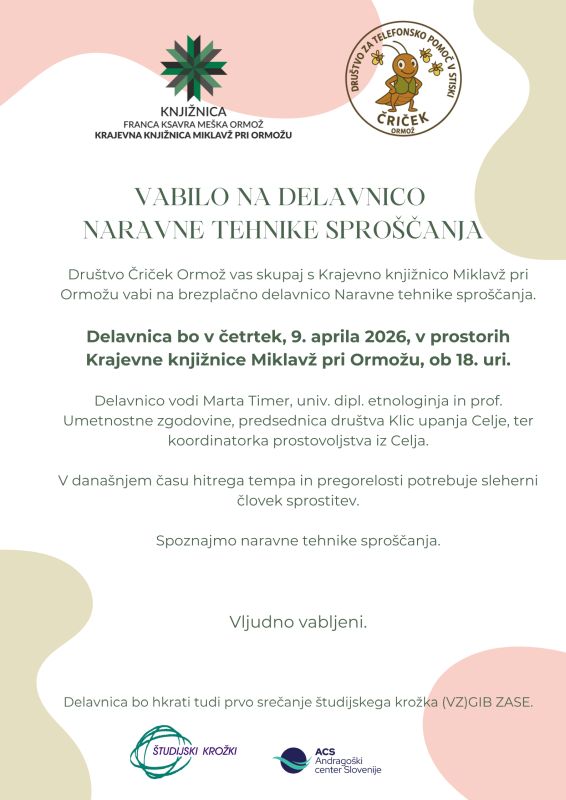 Društvo Čriček Ormož vas skupaj s Krajevno knjižnico Miklavž pri Ormožu, vabi na brezplačno delavnico Naravne tehnike sproščanja.