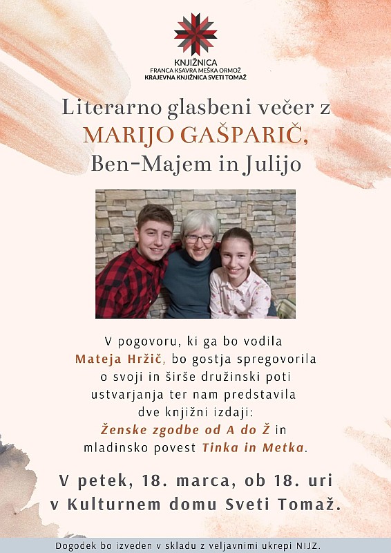 Večer nam bosta z glasbo popestrila Marijina vnuka Ben-Maj in Julija, mlada obetavna glasbenika, ki jima je besedila za nekatere njune pesmi napisala kar njuna babica.