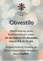 Spoštovani, obveščamo vas, da bo Knjižnica Ormož v torek, 24. decembra in 31. decembra, odprta od 8. do 13. ure.