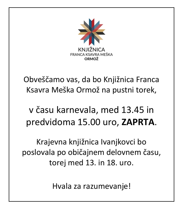 Obveščamo vas, da bo Knjižnica Franca Ksavra Meška Ormož na pustni torek, v času karnevala, med 13.45 in predvidoma do 15.00 uro, ZAPRTA.