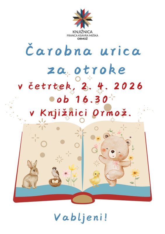 Otroci in starši, tik pred Veliko nočjo vas vabimo v Knjižnico Ormož na Čarobno urico. Tokrat bomo skupaj z medvedom in njegovimi prijatelji iskali prav posebna jajca. Jih bomo našli? Pridite, pa boste izvedeli! Ob tem pa si bomo tudi tokrat ustvarili nekaj posebnega.