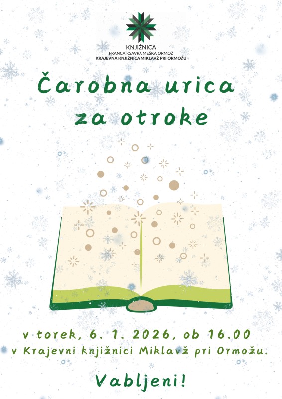 Dragi otroci, vabljeni na prvo letošnjo čarobno urico v Krajevno knjižnico Miklavž pri Ormožu.