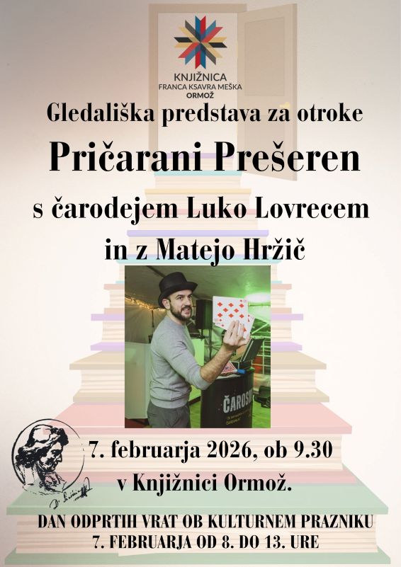 Ob 9.30 vabljeni na gledališko predstavo za otroke "Pričarani Prešeren", v izvedbi čarodeja Luka Lovreca in Mateje Hržič.