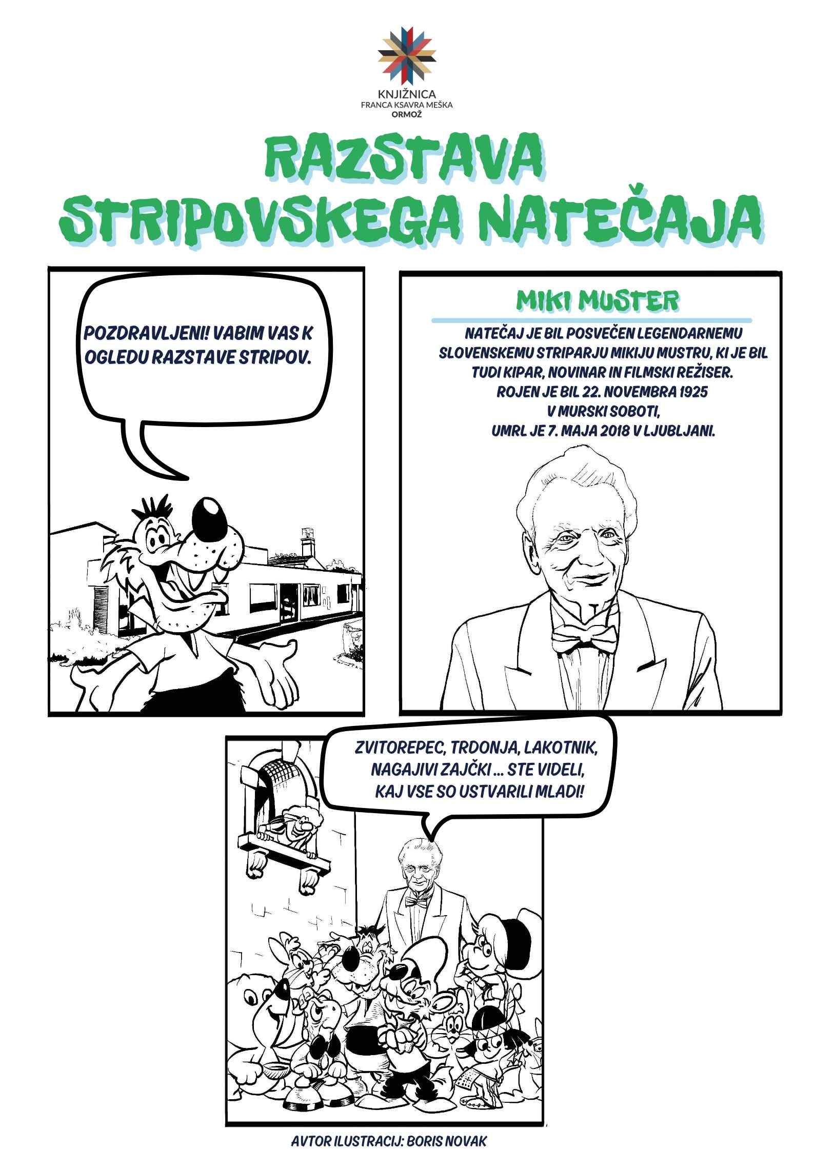 Knjižnica Franca Ksavra Meška Ormož je ob 100. obletnici rojstva legendarnega slovenskega striparja Mikija Mustra, pionirja slovenskega stripa in ustvarjalca nepozabnih junakov, kot so Zvitorepec, Trdonja in Lakotnik, razpisala STRIPOVSKI NATEĆAJ. Namen natečaja je bil spodbuditi vse generacije k razmišljanju o stripovski umetnosti, branju stripov in ustvarjanju lastnih zgodb v tej obliki. Na razpis se je odzvalo trideset ustvarjalcev različnih starosti, ki so s svojimi deli pokazali veliko domišljije, ustvarjalnosti in spoštovanja do stripovske umetnosti.
