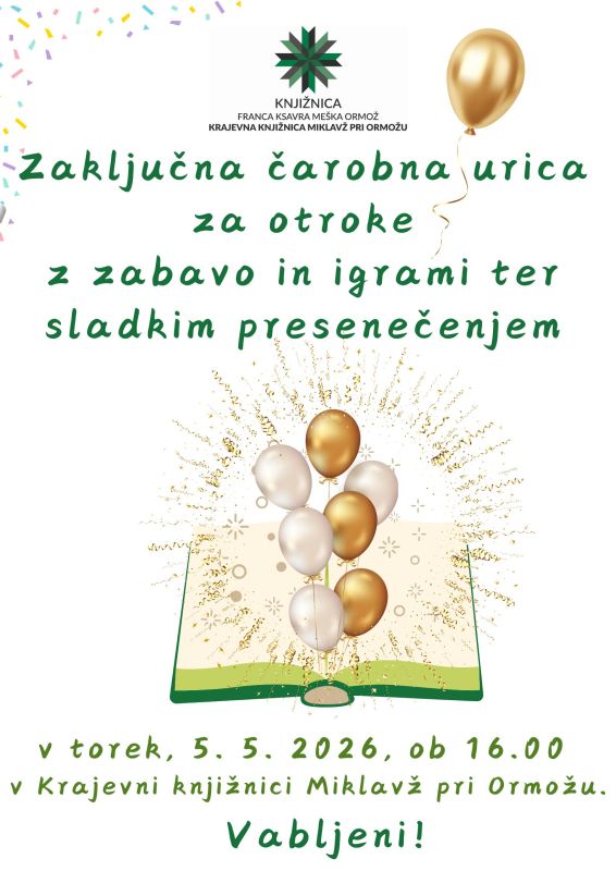 Otroci in starši, lepo vabljeni na zaključno čarobno urico v Krajevno knjižnico Miklavž pri Ormožu.