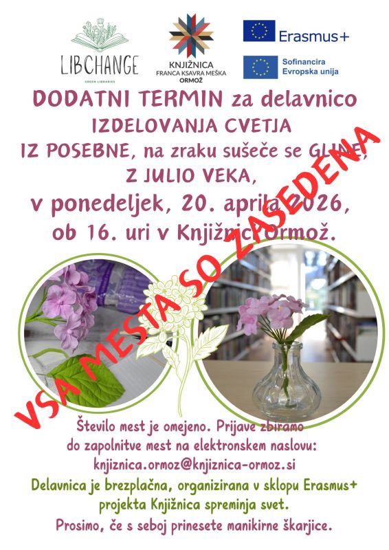 Zaradi povečanega zanimanja smo dodali še en termin za DELAVNICO IZDELOVANJA CVETJA IZ POSEBNE, na zraku sušeče se GLINE, Z JULIO VEKA.