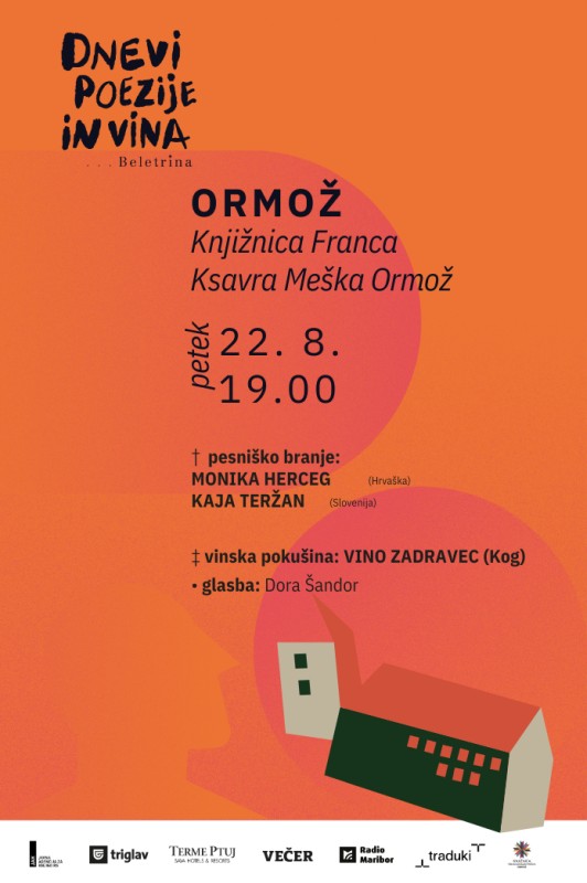 V knjižnici Franca Ksavra Meška Ormož se bosta na pesniškem branju na letni knjižnični terasi predstavili hrvaška pesnica Monika Herceg in slovenska pesnica Kaja Teržan. Glasbena gostja bo Dora Šandor, za degustacijo vina pa bo poskrbelo Vinogradništvo Zadravec s Koga.