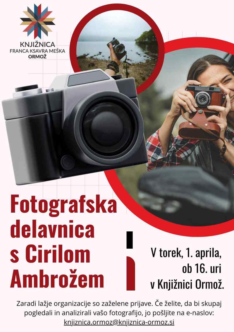 Ljubitelji fotografije, začetniki ali izkušenejši domači fotografi, vabljeni na Fotografsko delavnico s Cirilom Ambrožem, v torek, 1. aprila 2025, ob 16. uri v Knjižnico Ormož.
