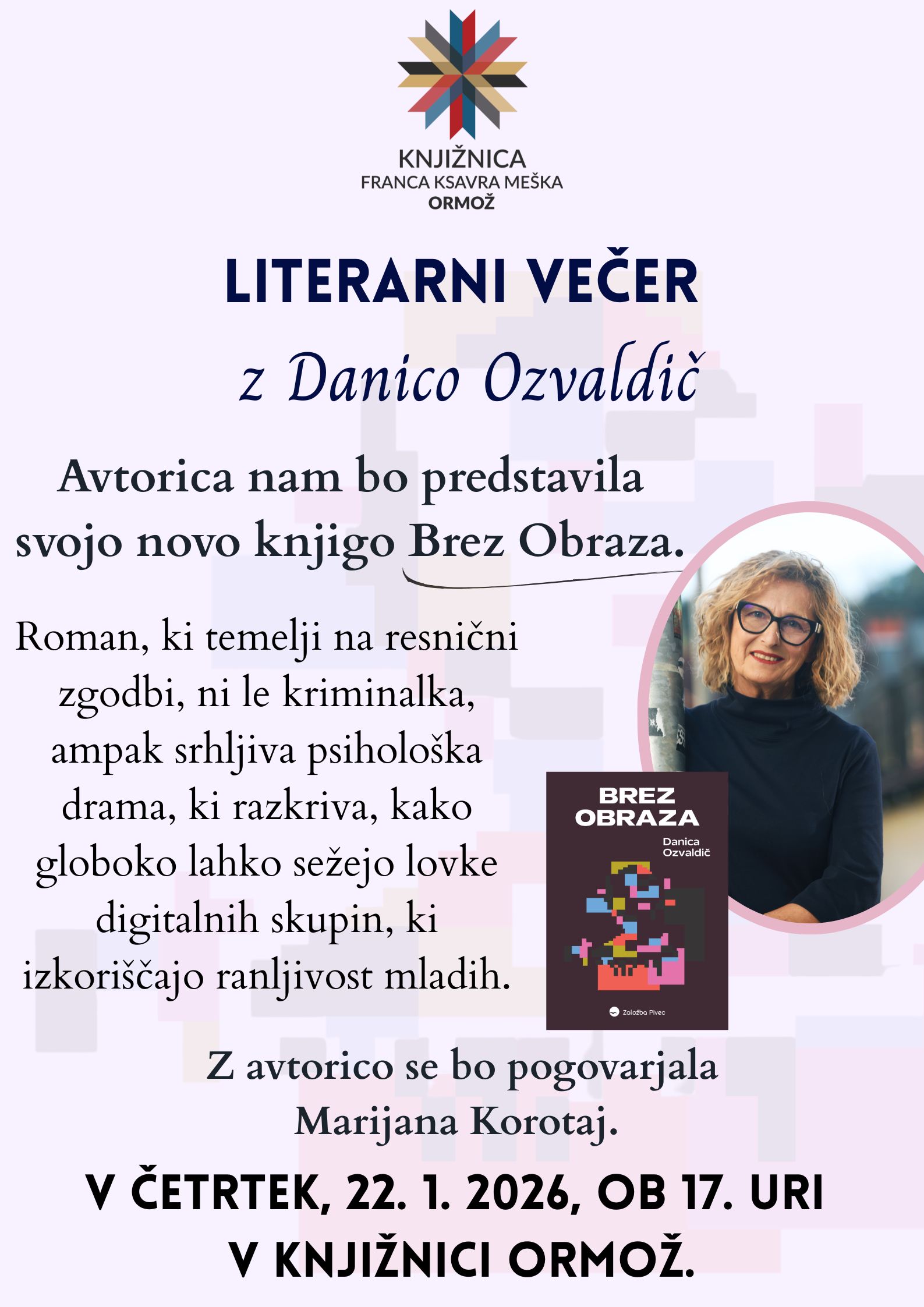 Roman Danice Ozvaldič Brez obraza (2025, Založba Pivec) je več kot kriminalka. Je srhljiva psihološka drama, ki razkriva, kako globoko lahko sežejo lovke digitalnih skupin, ki izkoriščajo ranljivost mladih. Ko se kriminalistka Lila Kory in inšpektor Anton Ludowich poglobita v primer, odkrijeta mrežo manipulacije, spletnih identitet in smrti, ki niso naključje.
