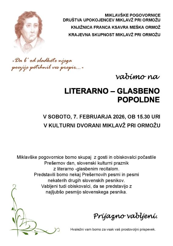 Miklavške pogovornice Društva upokojencev Miklavž pri Ormožu v sodelovanju s Krajevno knjižnico Miklavž pri Ormožu in Krajevno skupnostjo Miklavž pri Ormožu vabijo na Literarno-glasbeno popoldne v Kulturno dvorano Miklavž pri Ormožu.