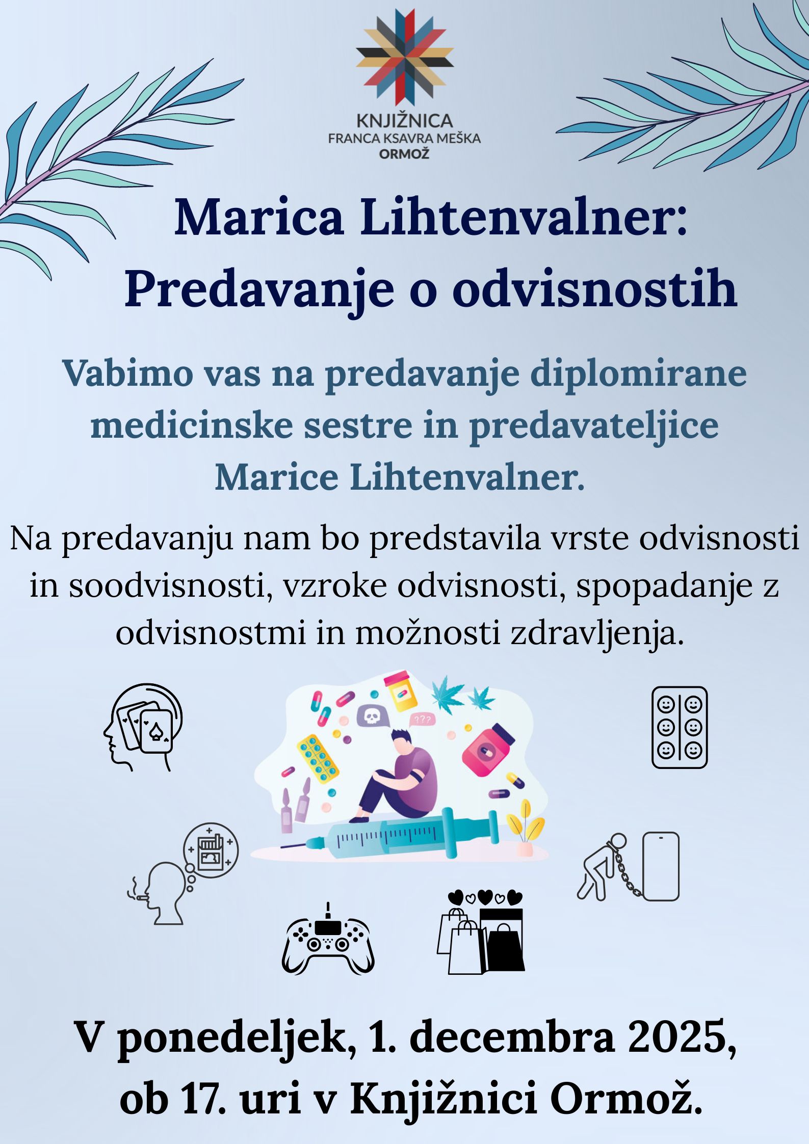 Vabimo vas na predavanje diplomirane medicinske sestre in predavateljice Marice Lihtenvalner, ki ima več kot 40 let delovnih izkušenj na področju odvisnosti in duševnega zdravja. Predstavila bo različne vrste odvisnosti in soodvisnosti, njihove vzroke ter načine spopadanja z boleznijo odvisnosti. Predstavila bo tudi možnosti zdravljenja in podpore na poti do okrevanja.