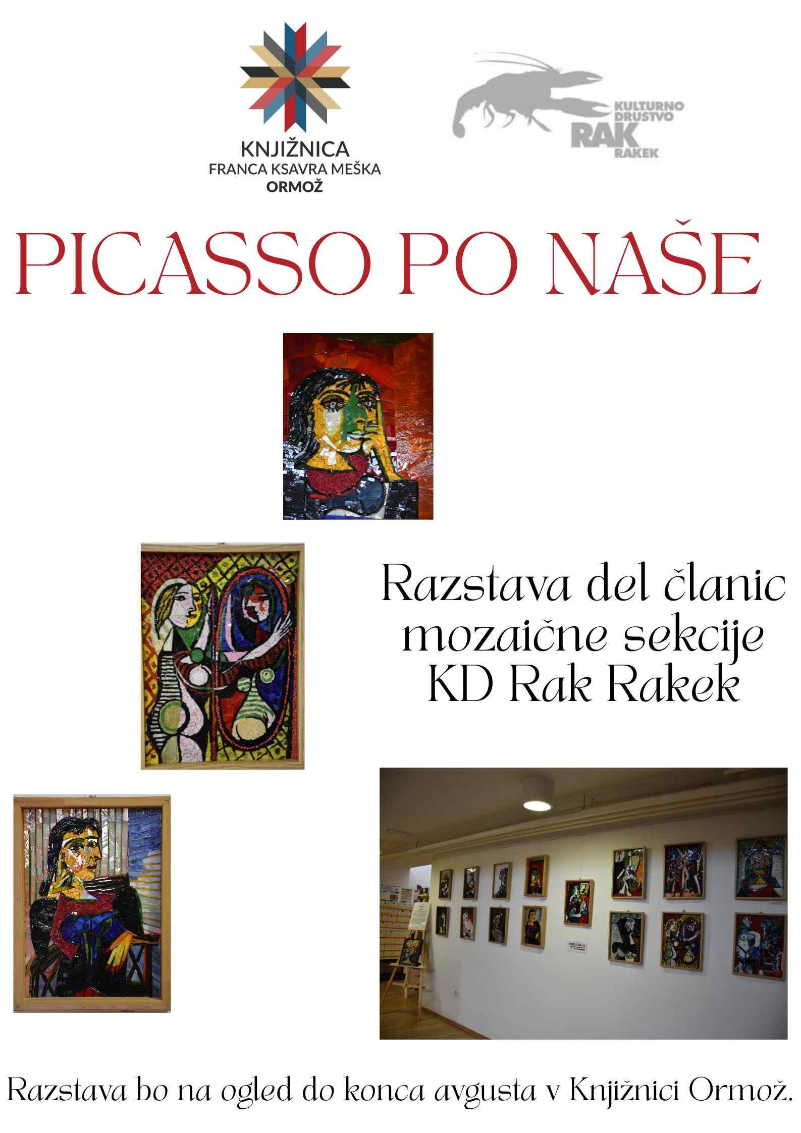 Mozaičarji, člani Kulturnega društva Rak Rakek, so pod vodstvom Karmen Petrič v Knjižnici Ormož na ogled postavili razstavo mozaikov Picassovih žensk, ki so jo poimenovali Picasso po naše.