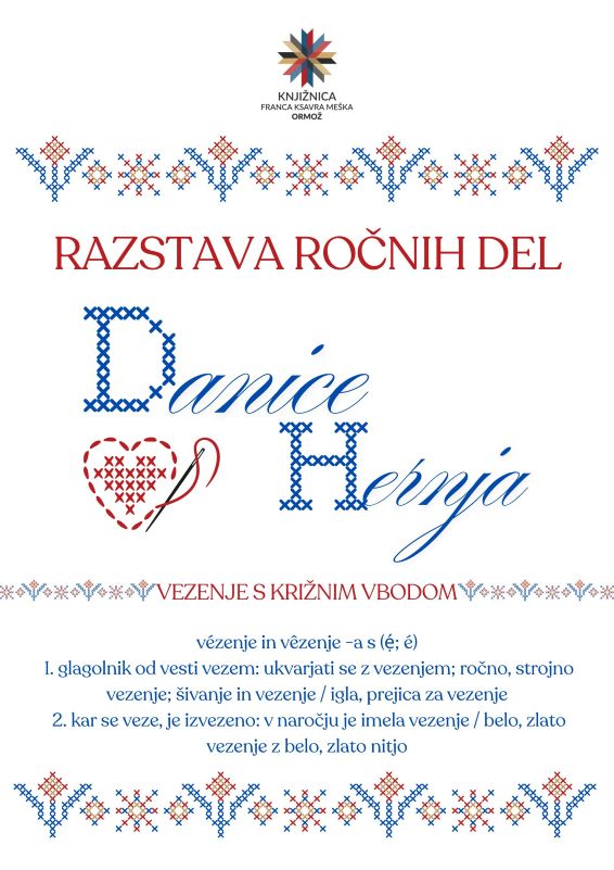 V Knjižnici Ormož se predstavlja domačinka Danica Hernja, ki razstavlja svojo bogato zbirko ročno izvezenih prtičkov. Na njih je ustvarila raznolike motive – od sadja, cvetja, kavnih in čajnih skodelic, božičnih prizorov, pa vse do živali, abstraktnih oblik in etno vzorcev. Uporablja živahne barve, poseben izrazni učinek pa dosega z natančnimi barvnimi prehodi in tanjšimi nitmi, ki poudarjajo obrise motivov ali nakazujejo posebne vzorce, med njimi tudi afriški etno motiv.
