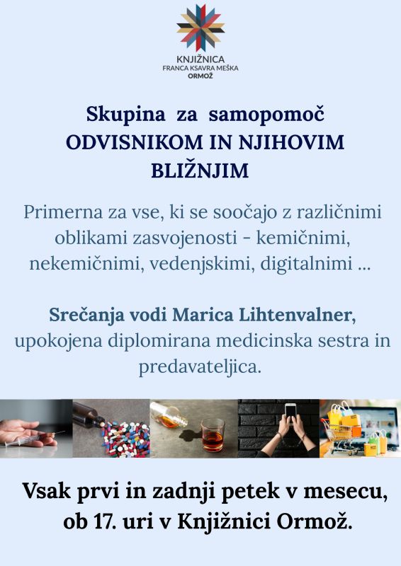 S prvim petkom v mesecu februarju pričenjamo z novo skupino za pomoč odvisnikom in njihovim bližnjim. Skupina je primerna za vse, ki se soočajo z različnimi oblikami zasvojenosti - kemičnimi, nekemičnimi, vedenjskimi, digitalnimi ...