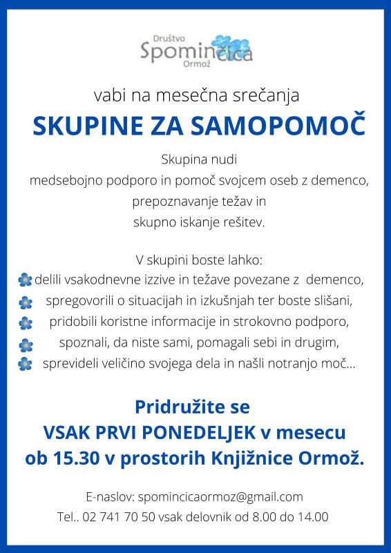 Društvo Spominčica Ormož vabi svojce obolelih oseb za demenco na srečanja Skupine za samopomoč. Skupina je namenjena svojcem, ki se v družini srečujejo s težko boleznijo, da se z demenco lažje soočijo in se bolje pripravijo na dolgoletno skrb za osebo z demenco. V dragoceno pomoč so praktični nasveti in izkušnje iz življenja tistih, ki so vpeti v vsakdanjo oskrbo osebe z demenco.