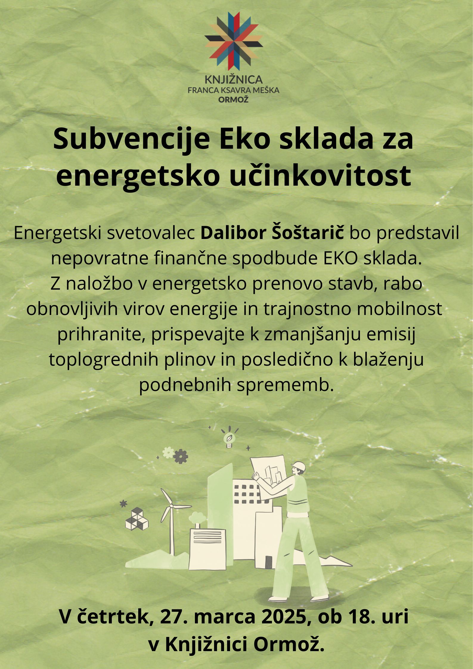 Energetski svetovalec mreže Ensvet, Dalibor Šoštarič, bo predstavil subvencije Eko sklada, ki prinašajo številne koristi. S spodbujanjem naložb v energetsko prenovo stavb, rabo obnovljivih virov energije in trajnostno mobilnost prispevajo k zmanjšanju emisij toplogrednih plinov in posledično k blaženju podnebnih sprememb. Poleg tega subvencije posameznikom omogočajo lažji dostop do naprednih energetskih rešitev, ki na dolgi rok prinašajo prihranke pri stroških ogrevanja, hlajenja in transporta ter zmanjšujejo energetsko revščino v gospodinjstvih z nizkimi dohodki.