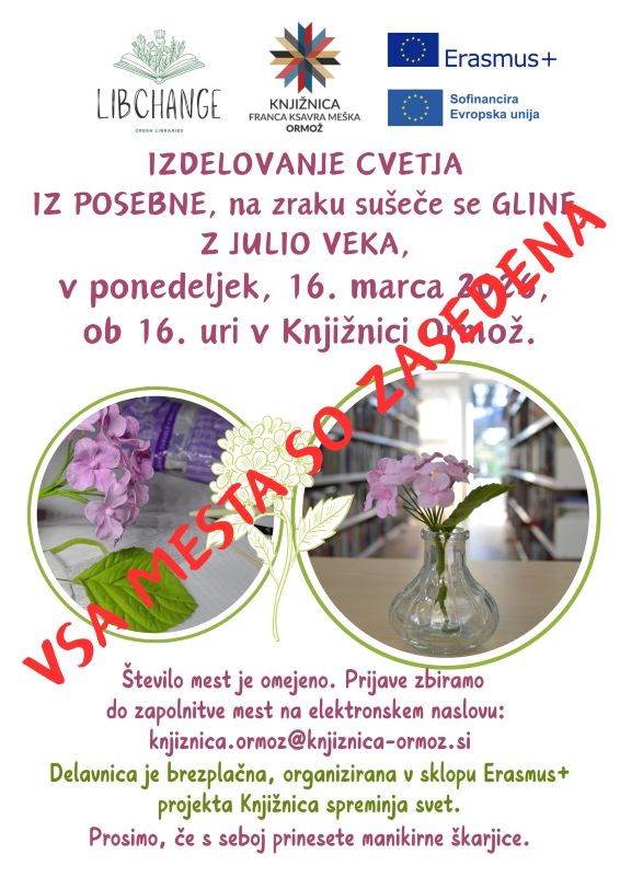 Vabljeni na DELAVNICO IZDELOVANJA CVETJA IZ POSEBNE, na zraku sušeče se GLINE, Z JULIO VEKA v ponedeljek, 16. marca 2026, ob 16. uri v Knjižnici Ormož.